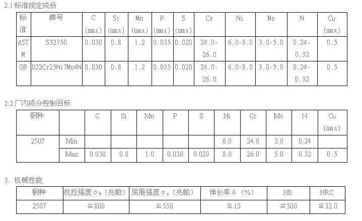 1.1 原材料简述:2507是一种金相组织—马氏体(两相)不锈钢板,它结合了很多铁素体钢和奥氏体钢最有好处的特性, 因为该钢铬和钼含量都非常高,因而具备极佳的抗点腐蚀,韧性断裂和均匀腐蚀能力.双重显微组织确保了这一钢具有较高的抗晶间腐蚀裂开能力,并且冲击韧性也非常高.