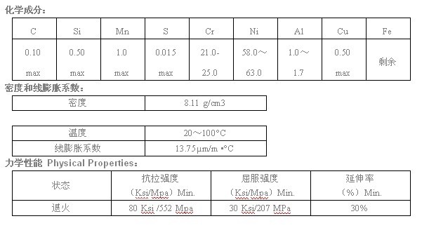* 该铝合金在热浸蚀行业中如硫化橡胶自然环境,特别是达到1100℃周而复始的空气氧化和炭化环境里具备很好抗腐蚀水平。